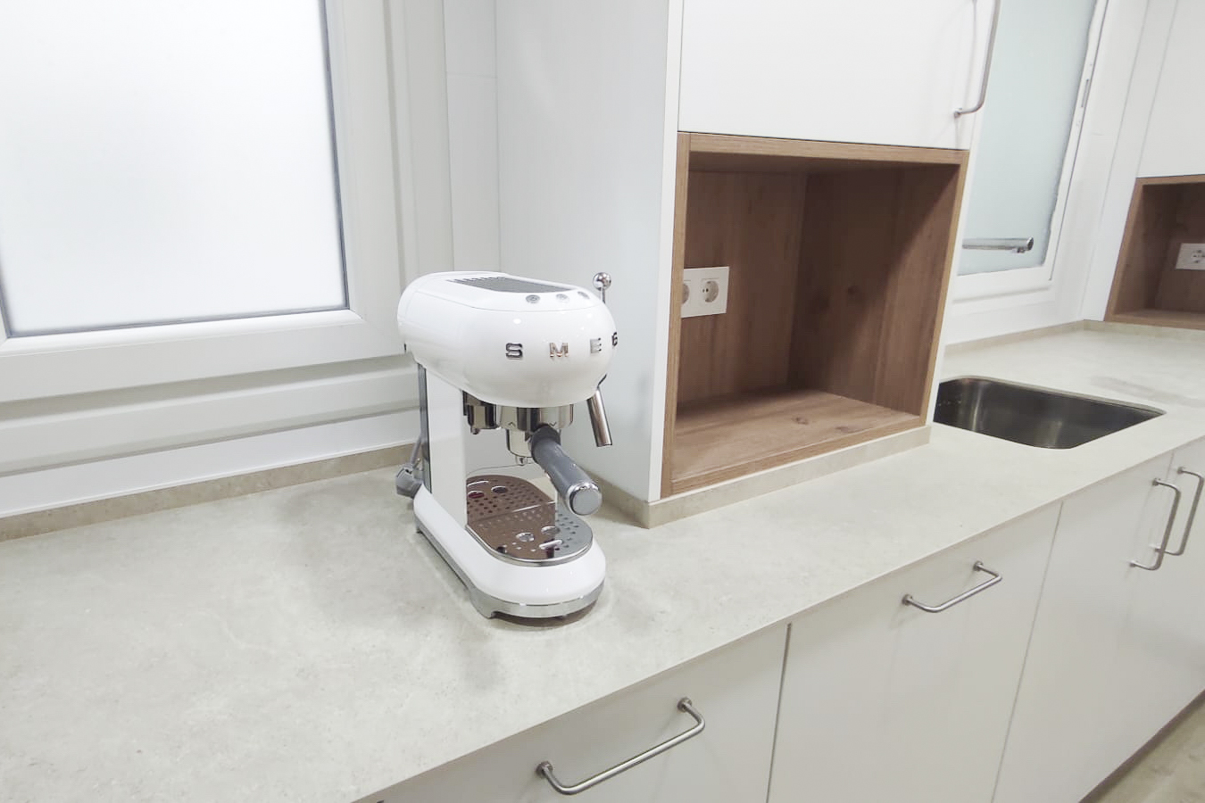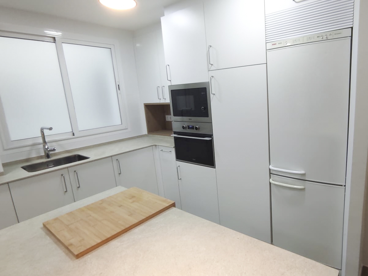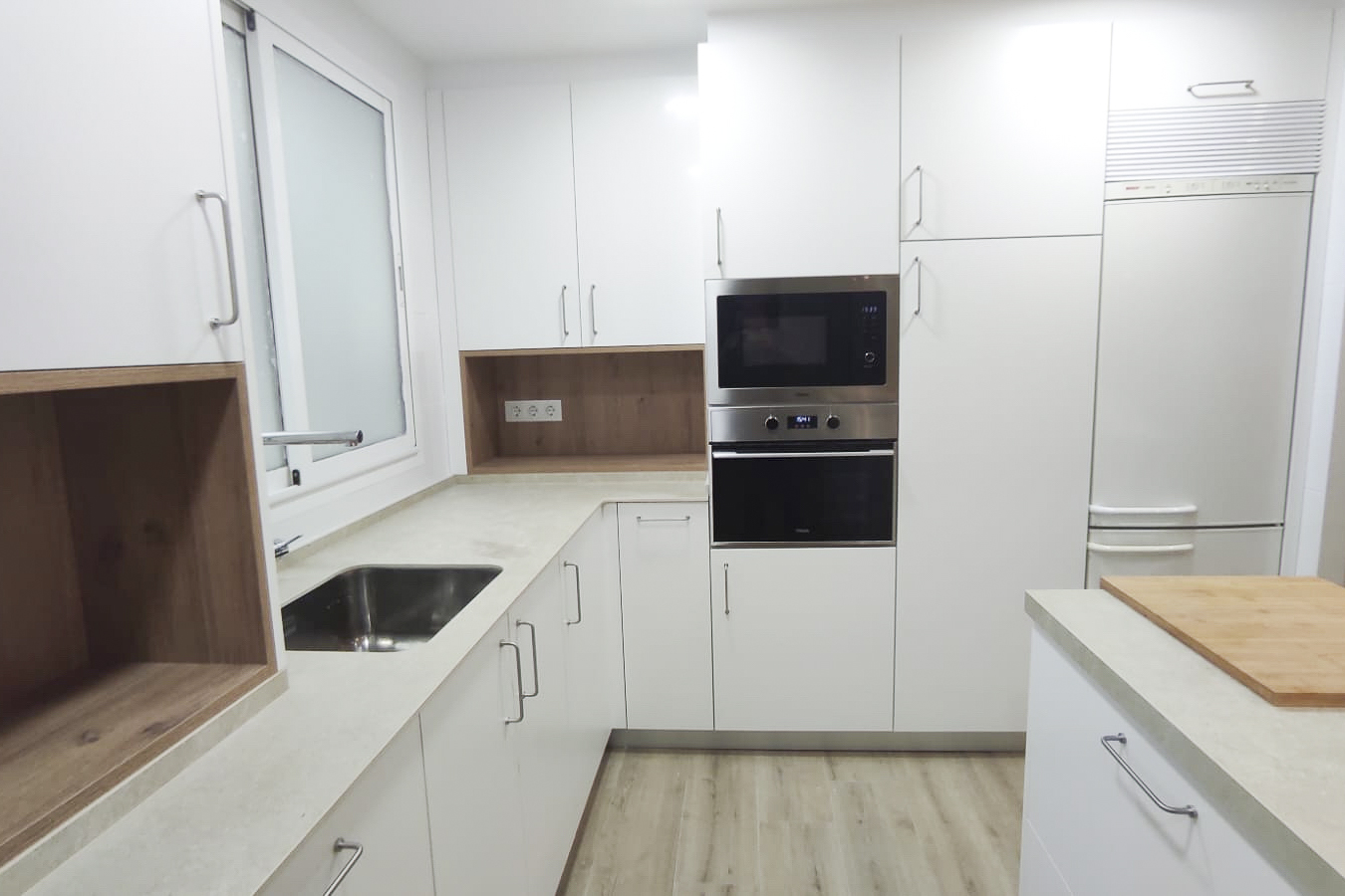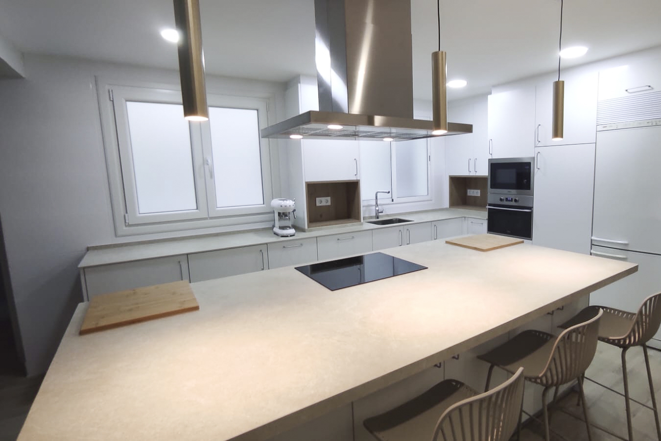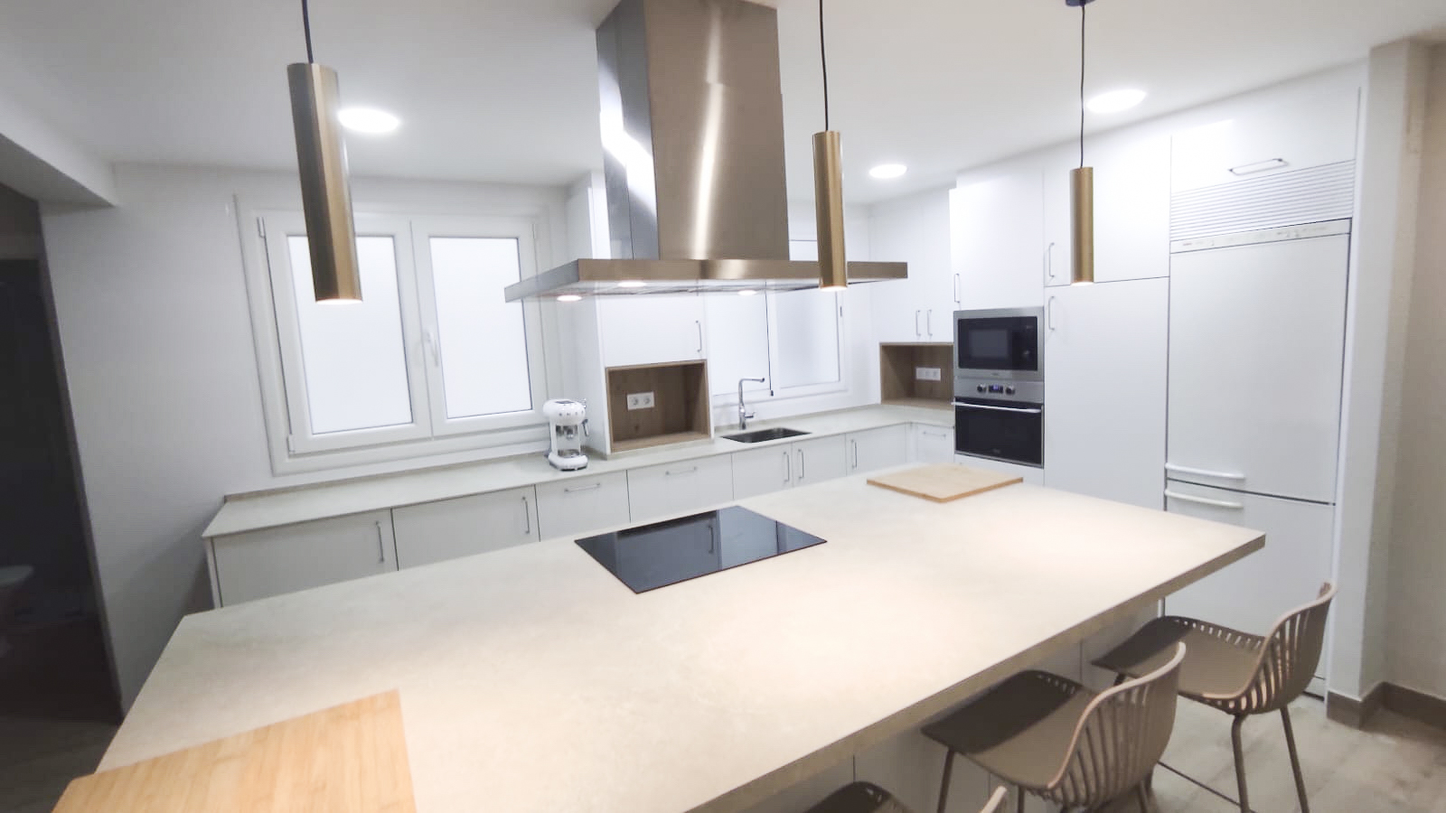 Esta bonita vivienda le realizamos una reforma parcial. Trabajamos en la cocina diseñando una cocina clásica, nuestro modelo LINARES en acabado lacado en blanco mate seda, con la encimera en DEKTON KAIROS con entrepaño, destacado por la iluminación auxiliar bajo los muebles altos con tira de led continua encapsulada. Realizamos la pared sobre la que apoyamos la mesa de cocina con unos azulejos porcelánicos de gran formato con relieve en tonos piedra, aportando movimiento a la estancia.
