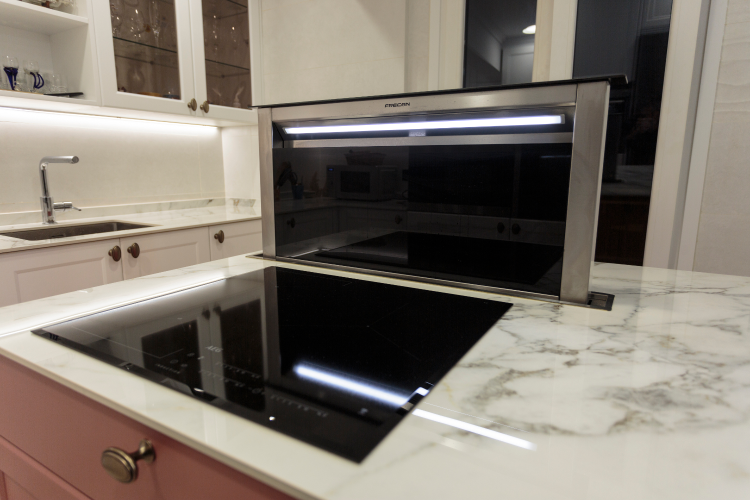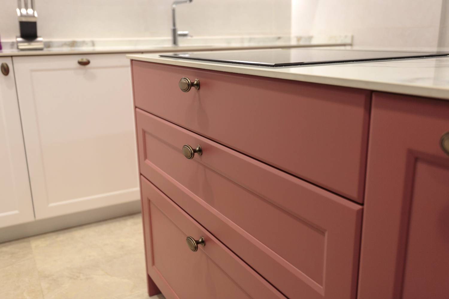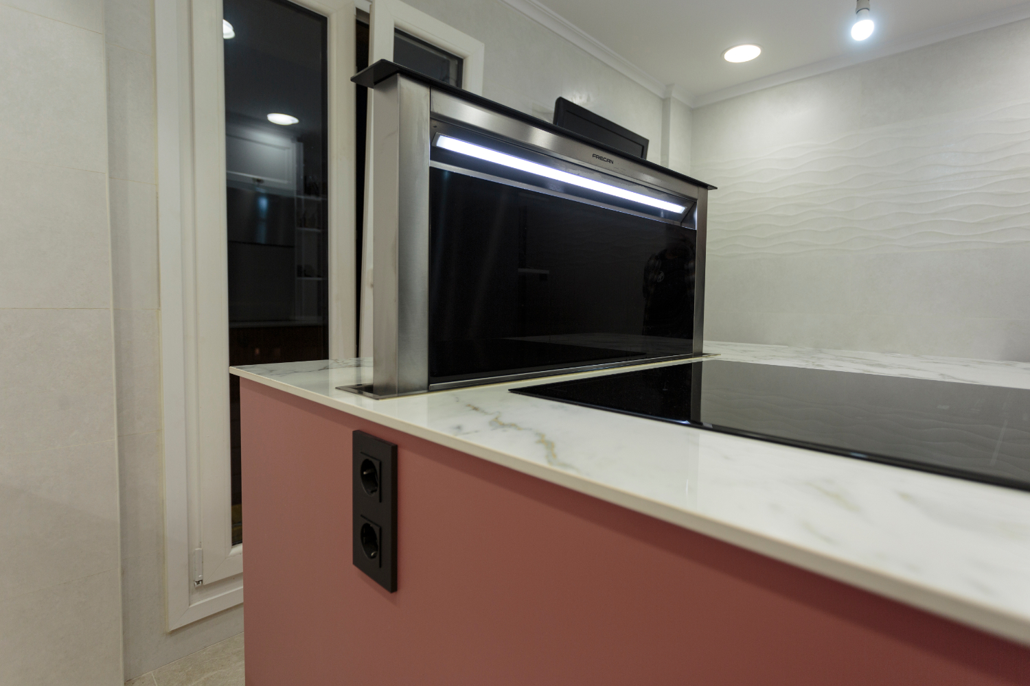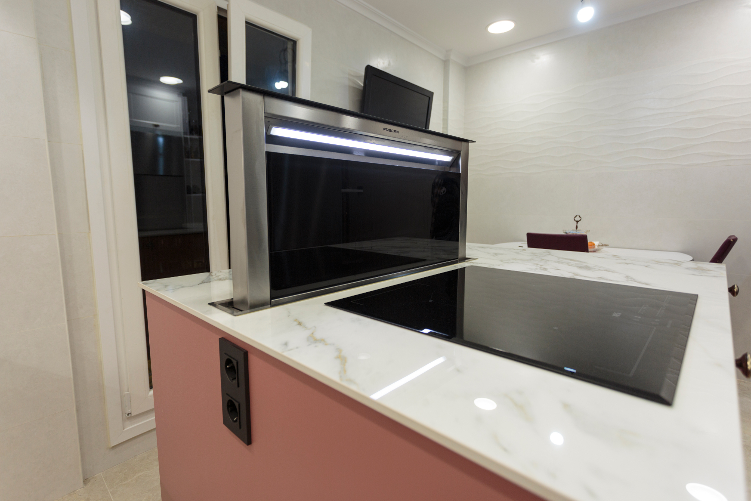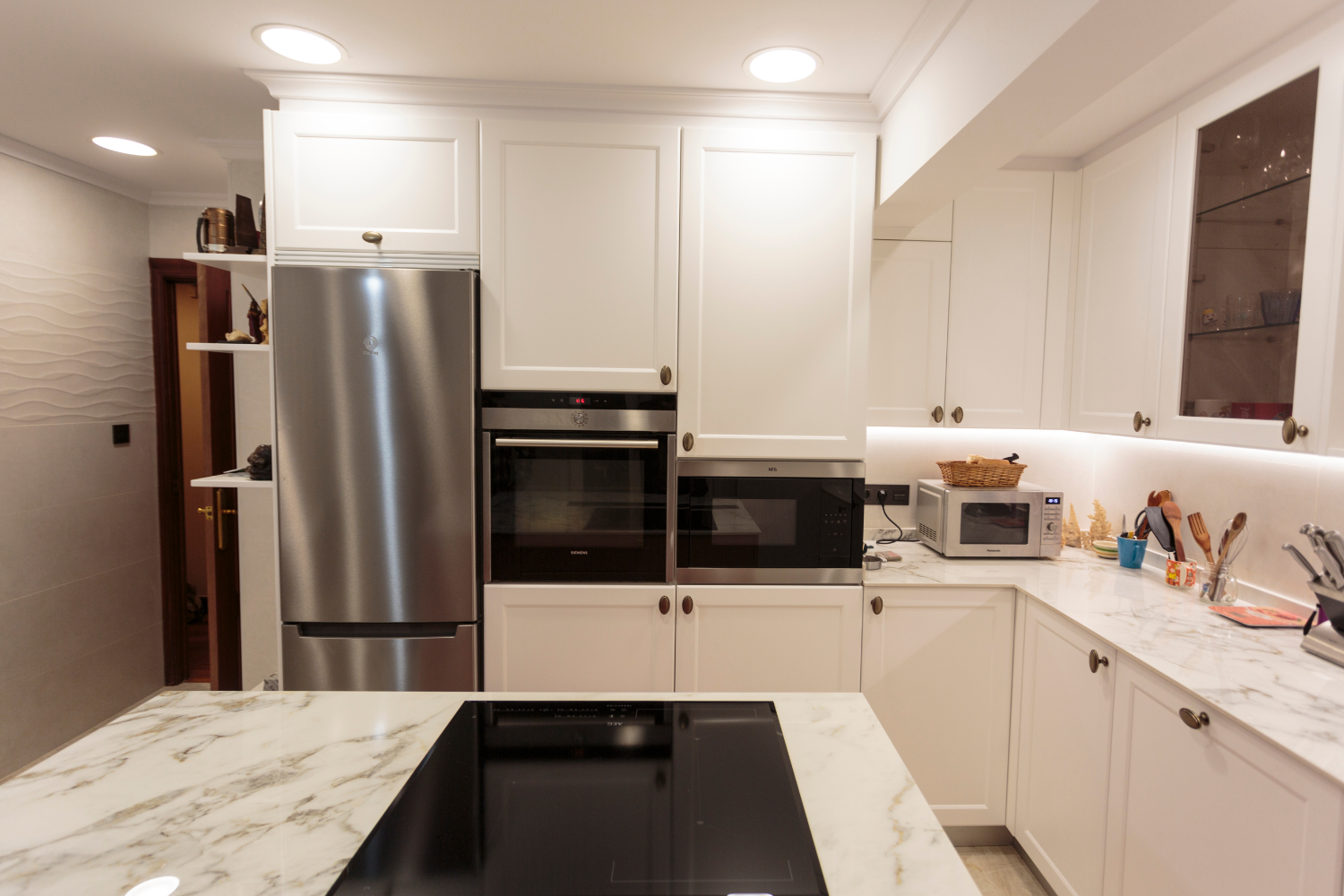 Esta cocina es la nueva versión de una cocina clásica con puertas enmarcadas. En esta cocina destacar su distribución en L para la zona de aguas y de columnas y una isla central donde alojamos la placa de inducción con la campana de encimera de FRECAN, convirtiéndose en la gran protagonista de la cocina, electrodomésticos integrados bajo la encimera en la zona de agua, y herrajes extraíbles interiores en los muebles bajos que hacen que no sea ningún problema el acceso a los mismos, siendo para el uso diario la comodidad imprescindible.