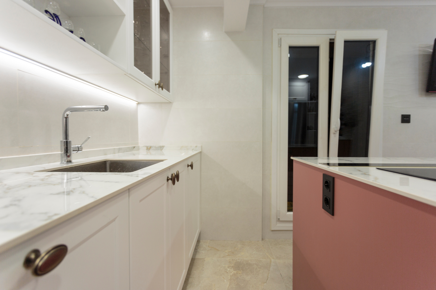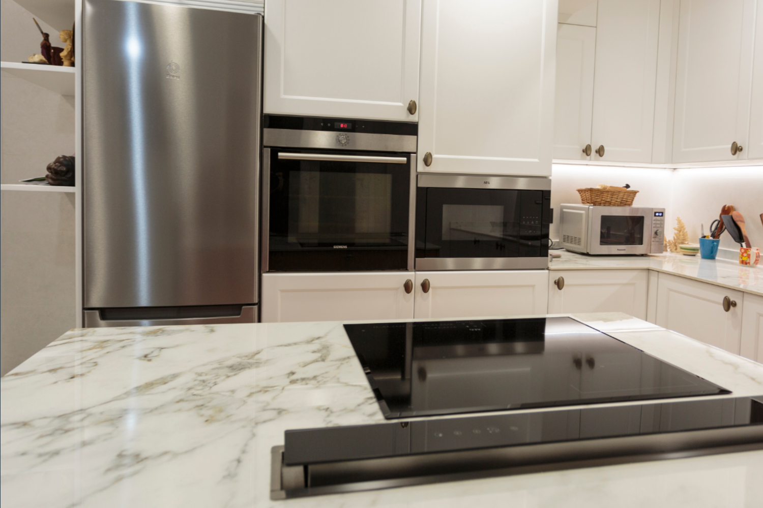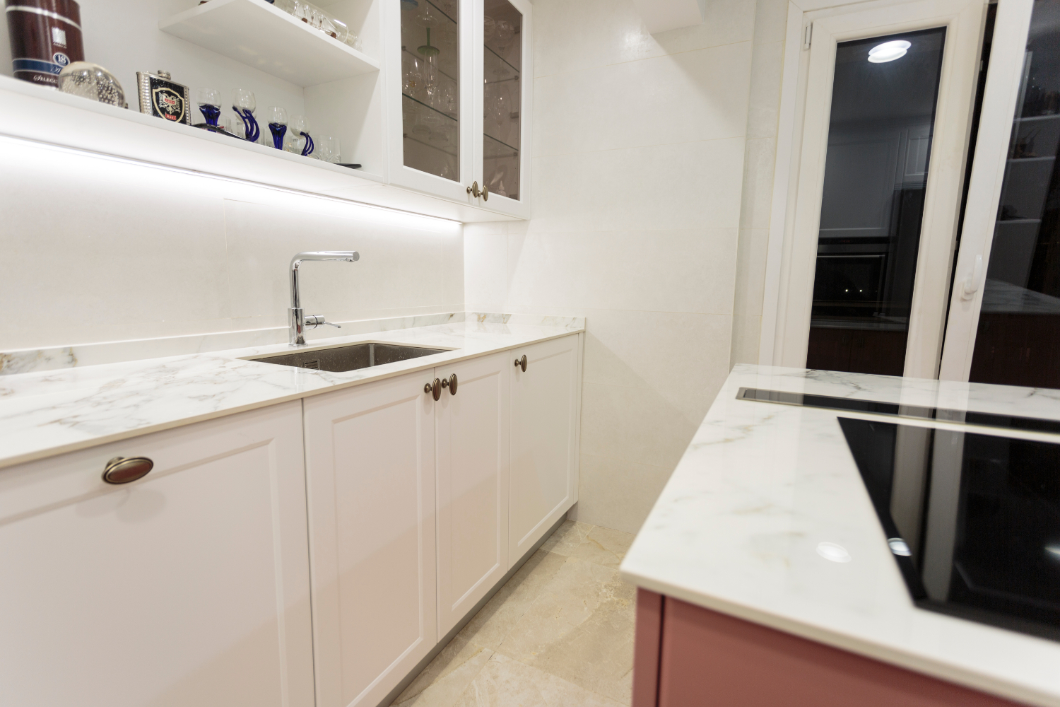 Realza los muebles la encimera de NUOVOCORSO porcelánico BALLET en pulido ultra brillo. Capacidad, comodidad y que la cocina sea la estancia donde la familia se reúne y disfruta era el objetivo y es el resultado.