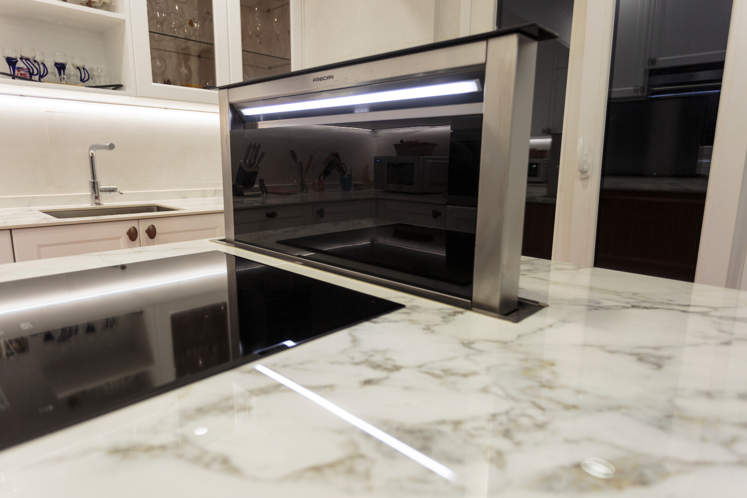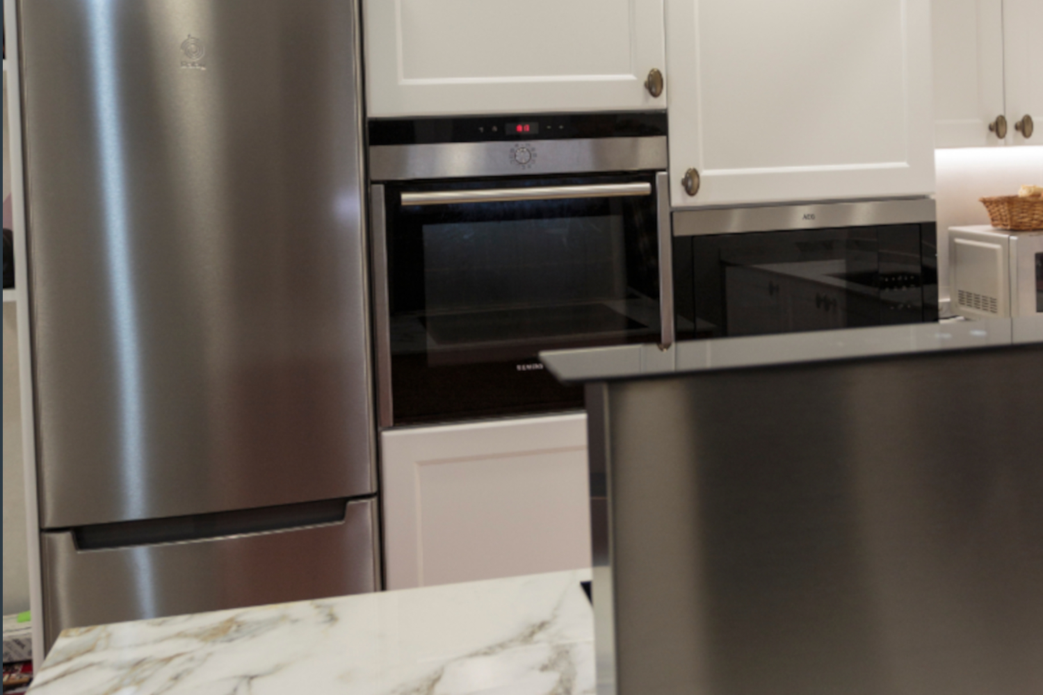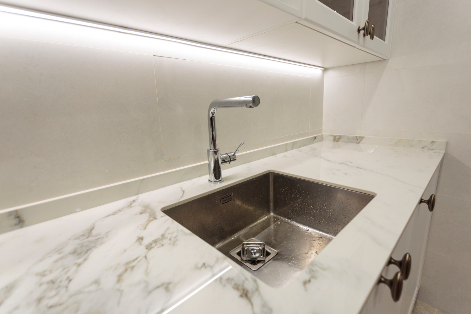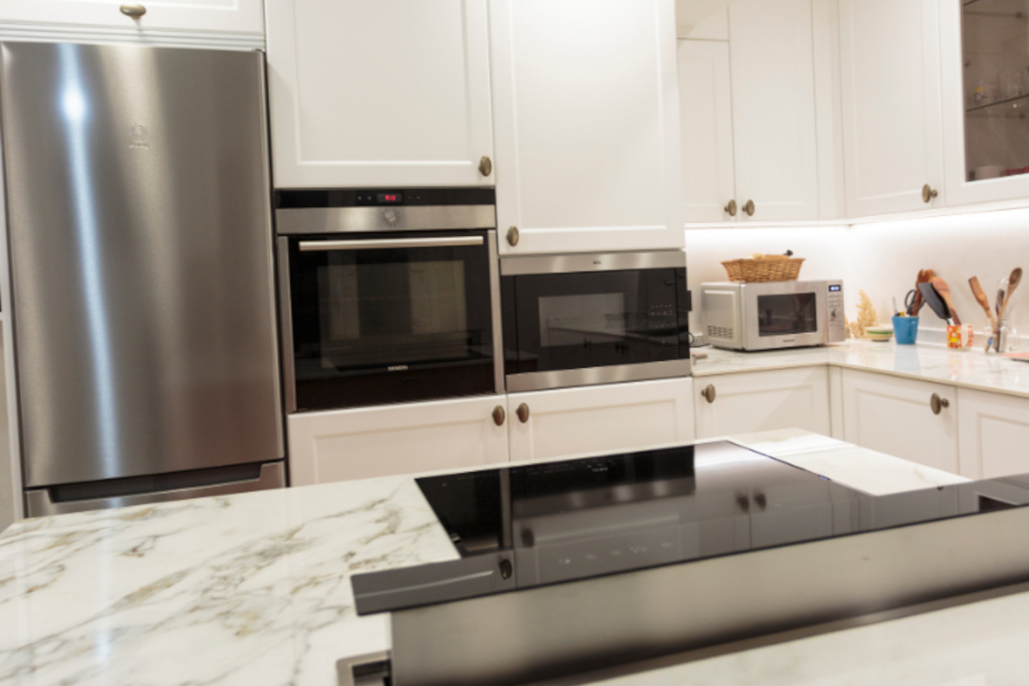 Realza los muebles la encimera de NUOVOCORSO porcelánico BALLET en pulido ultra brillo. Capacidad, comodidad y que la cocina sea la estancia donde la familia se reúne y disfruta era el objetivo y es el resultado.