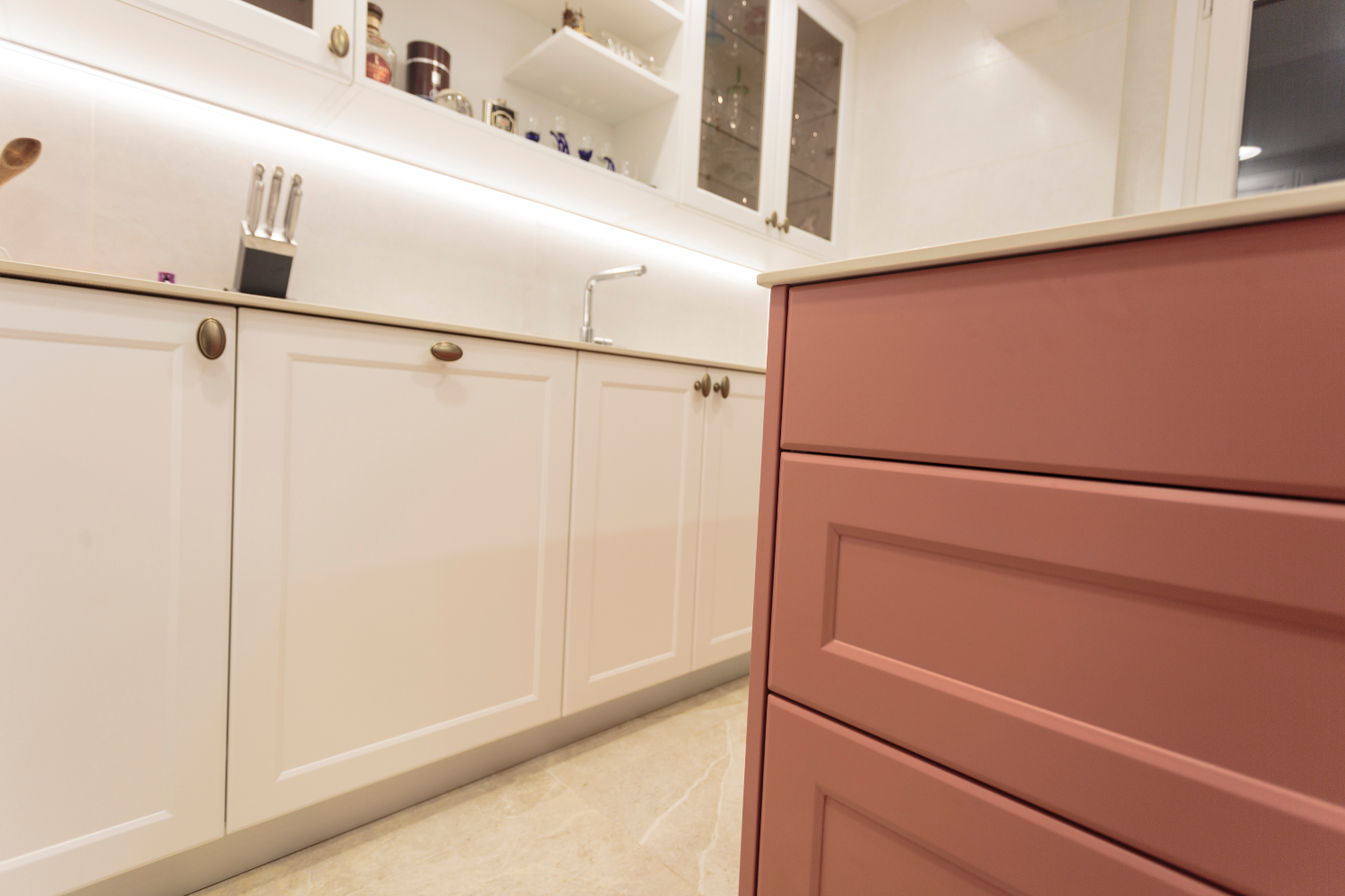 Los muebles son nuestro modelo LINARES en acabado LACADO usamos el tono blanco y el tono terracota en la isla central y ambos en el acabado seda.