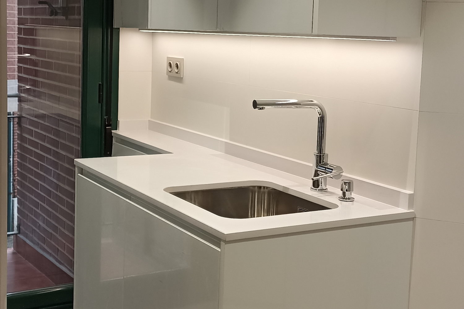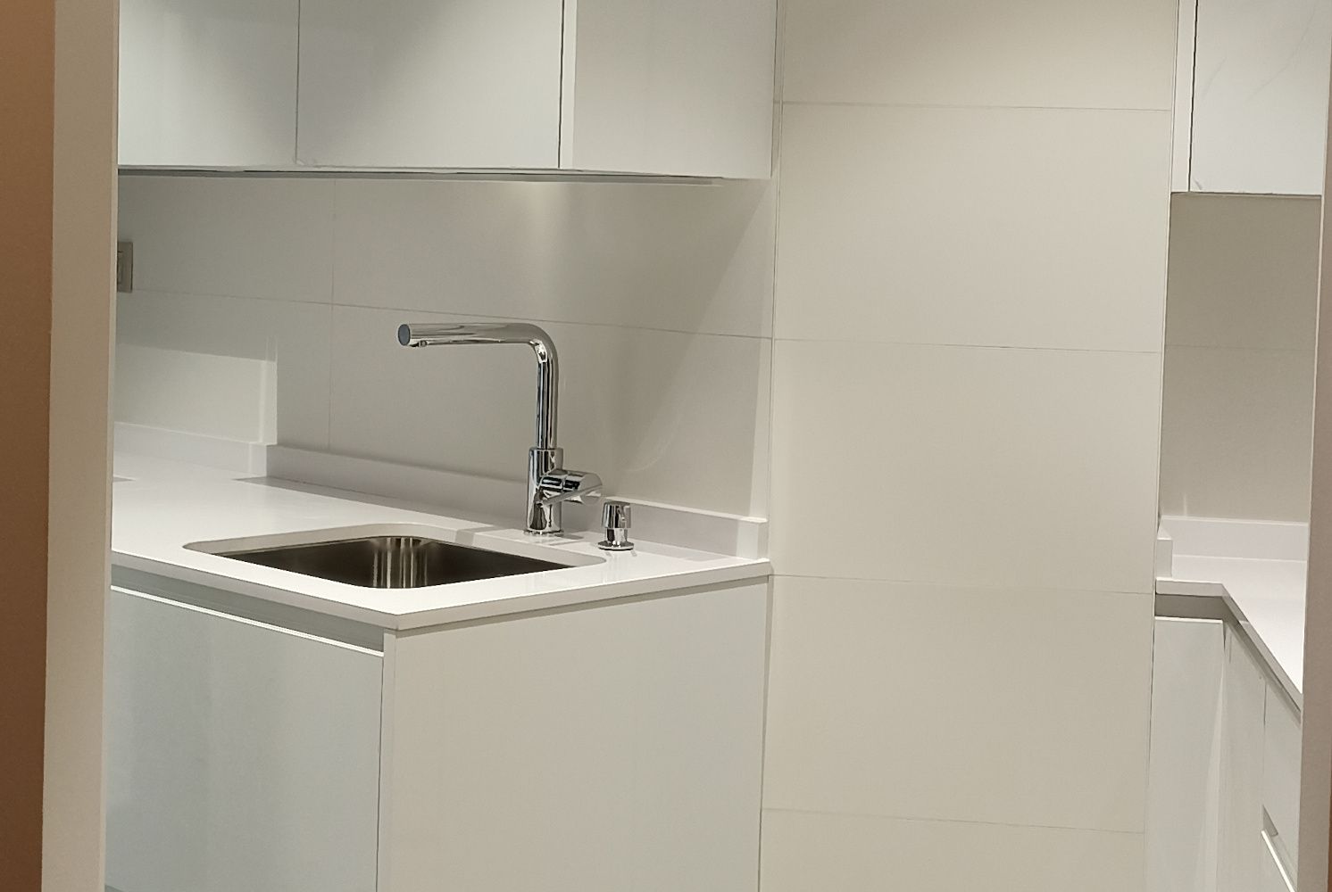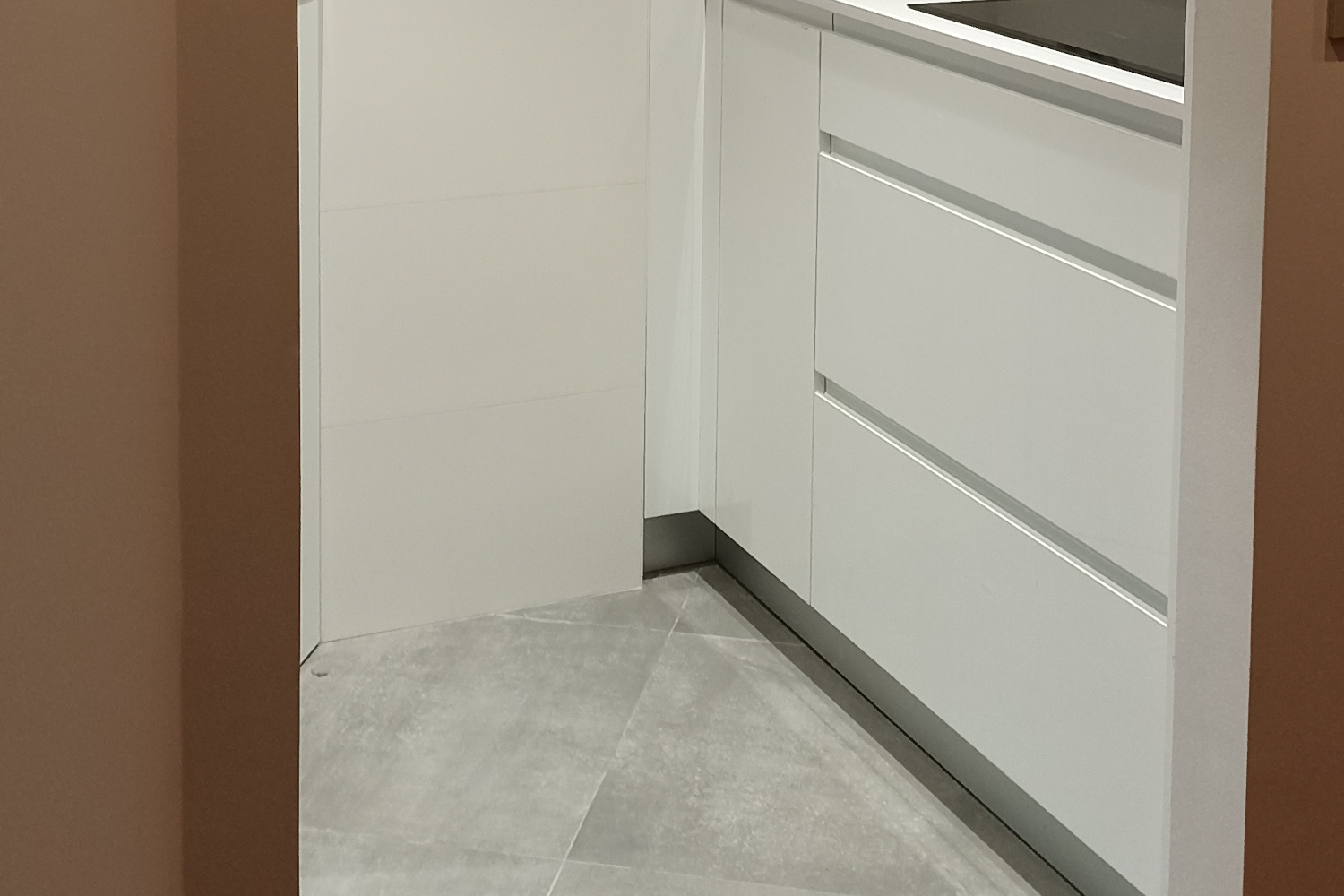 El mobiliario se ajustó al centímetro, gracias a nuestro fabricante y al montaje preciso realizado, el resultado es una cocina que pese a lo que pueda parecer; al diario es cómoda y tiene cubiertas todas las necesidades de la cocina.